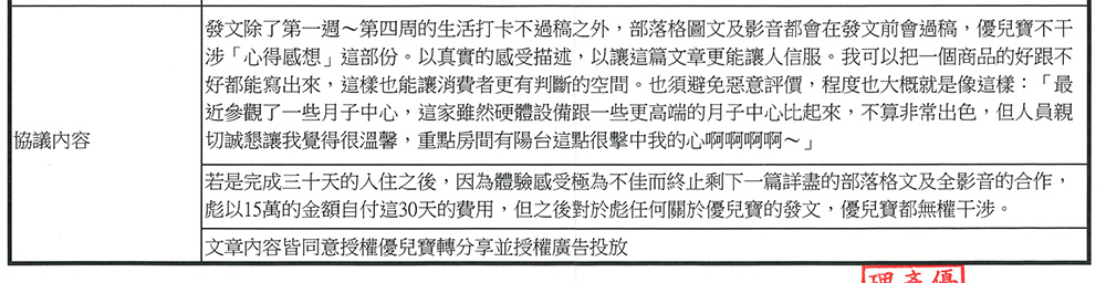 聲明:雖然本篇是合作文,但我敢說所有內容句句屬實。如果你有長期追蹤我,就會知道我不是個會為錢出賣良知的人,所以當初在跟優兒寶簽約的時候,我在合約上要求加上以下協議內容,如果入住後感受不佳,我寧願自己付錢也要寫死他們。當初懷劉肥鵝的時候,住月子中心的錢我自己早就準備好了,所以當時也參觀了很多家月子中心,包括要自己付錢的跟來找合作的(當時不只優兒寶來找合作)。因為比起「錢」,我覺得讓自己的女兒能好好被照顧、我在月子期間能好好休息,這些還更為重要。
