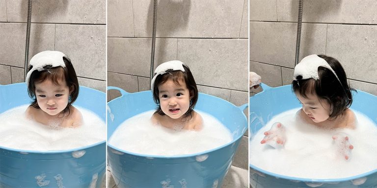 目前我都是用這個尺寸給劉肥鵝泡澡的,因為放水真的超快,兩分鐘就可以放好,所以她幾乎天天都可以泡澡。我都是放好水給她泡之後,我自己就開始洗澡,洗完澡了剛好從澡盆抱她起來幫她洗。這個尺寸泡2歲的寶寶應該算是緊繃了,但也因此非常安全,然後又超省水!一點點水就能讓她泡舒舒服服的精油浴,晚上都會變很好睡。